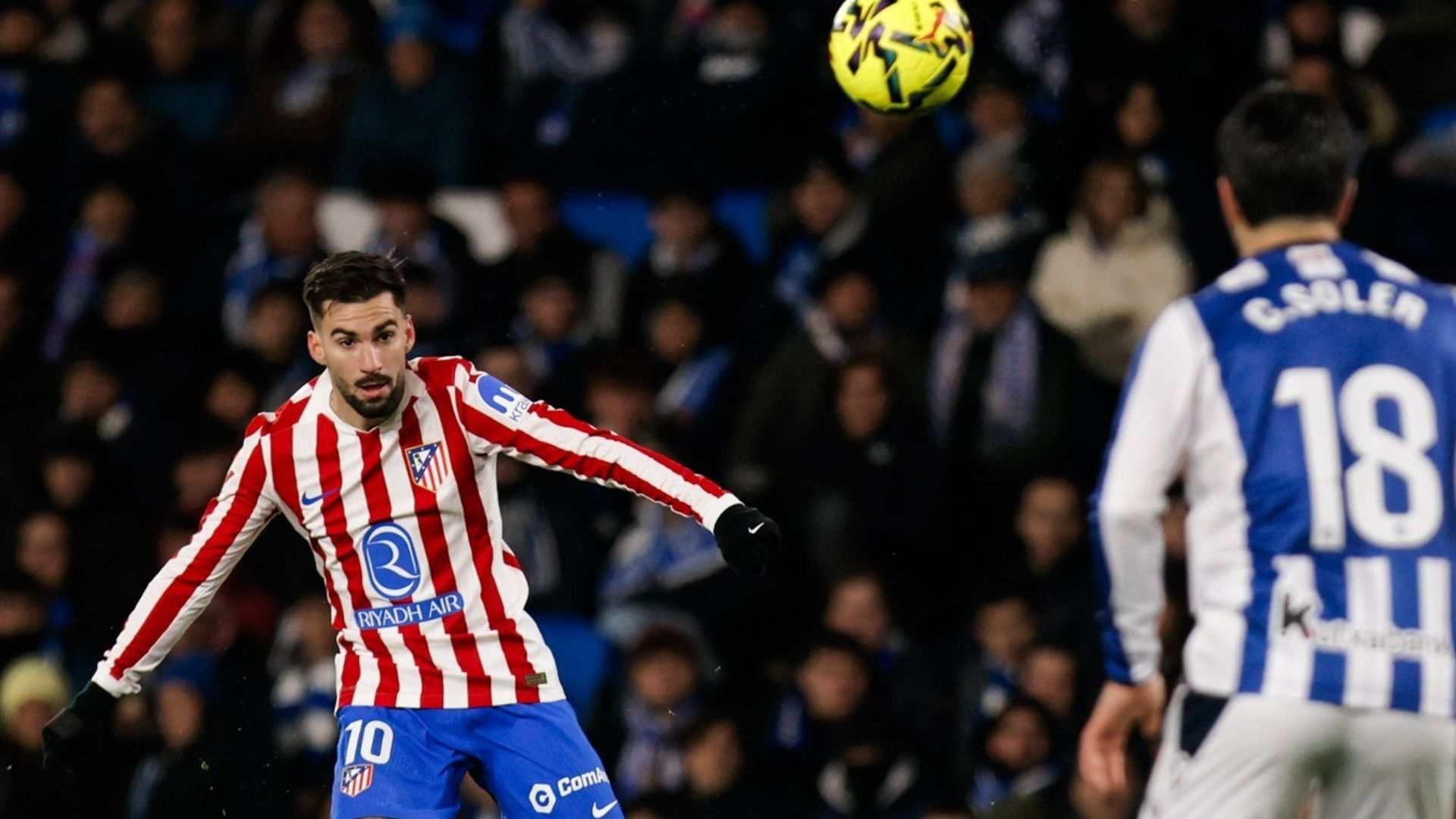 Durante todo el encuentro, la alta presión de los locales puso en aprietos al conjunto rojiblanco que se vio obligado a buscar un juego directo, aprovechándose de la altura de Sorloth. A pesar de esto, Julián Álvarez dispuso de dos oportunidades claras para poder adelantar al Atlético en el primer cuarto de hora. Sin embargo, ninguno de los disparos de la Araña se dirigían entre los tres palos. A partir de estas llegadas, los donostiarras apretaron en busca del gol.