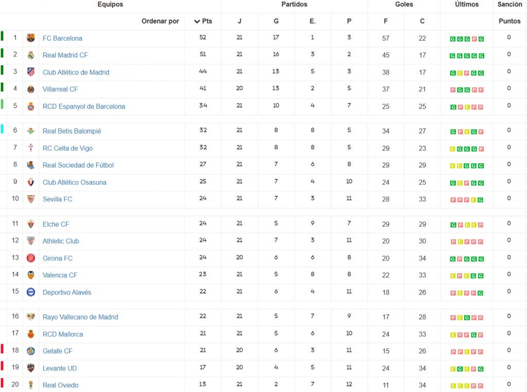 El torneo doméstico está actualmente al rojo vivo en el duelo por evitar el descenso. Entre Getafe, equipo que en estos instantes ocupa la 18º posición, y Real Sociedad, 8º clasificado, hay tan solo seis puntos de diferencia. Once equipos distanciados a solo dos partidos en la tabla de clasificación de La Liga.